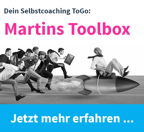 Einzeltrainings starten ab 750 €* – fair kalkuliert und auf deine individuelle Situation zugeschnitten. Das Selbstcoaching ToGo „Martins Toolbox“ gibt es bereits für einmalig 299 €.